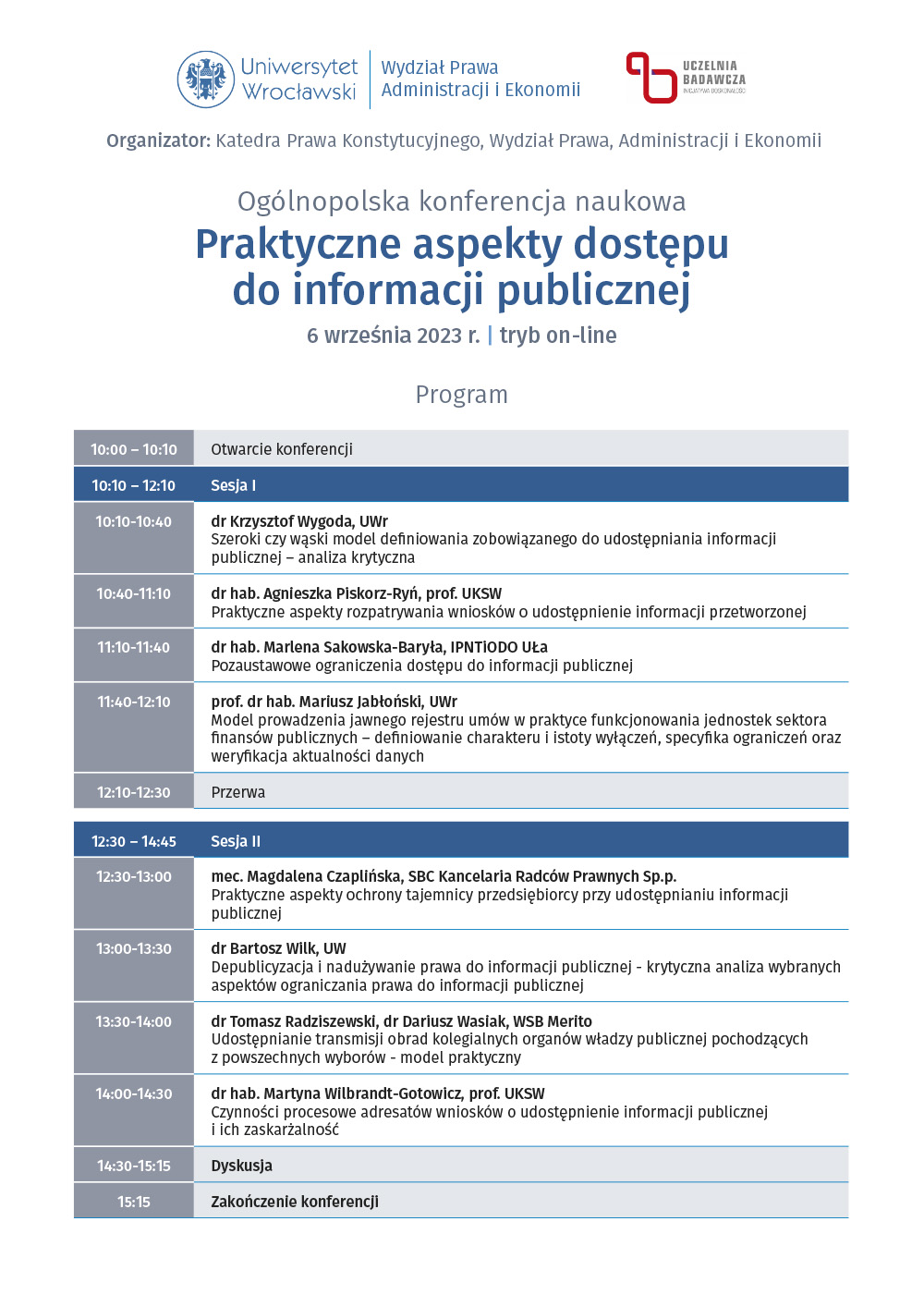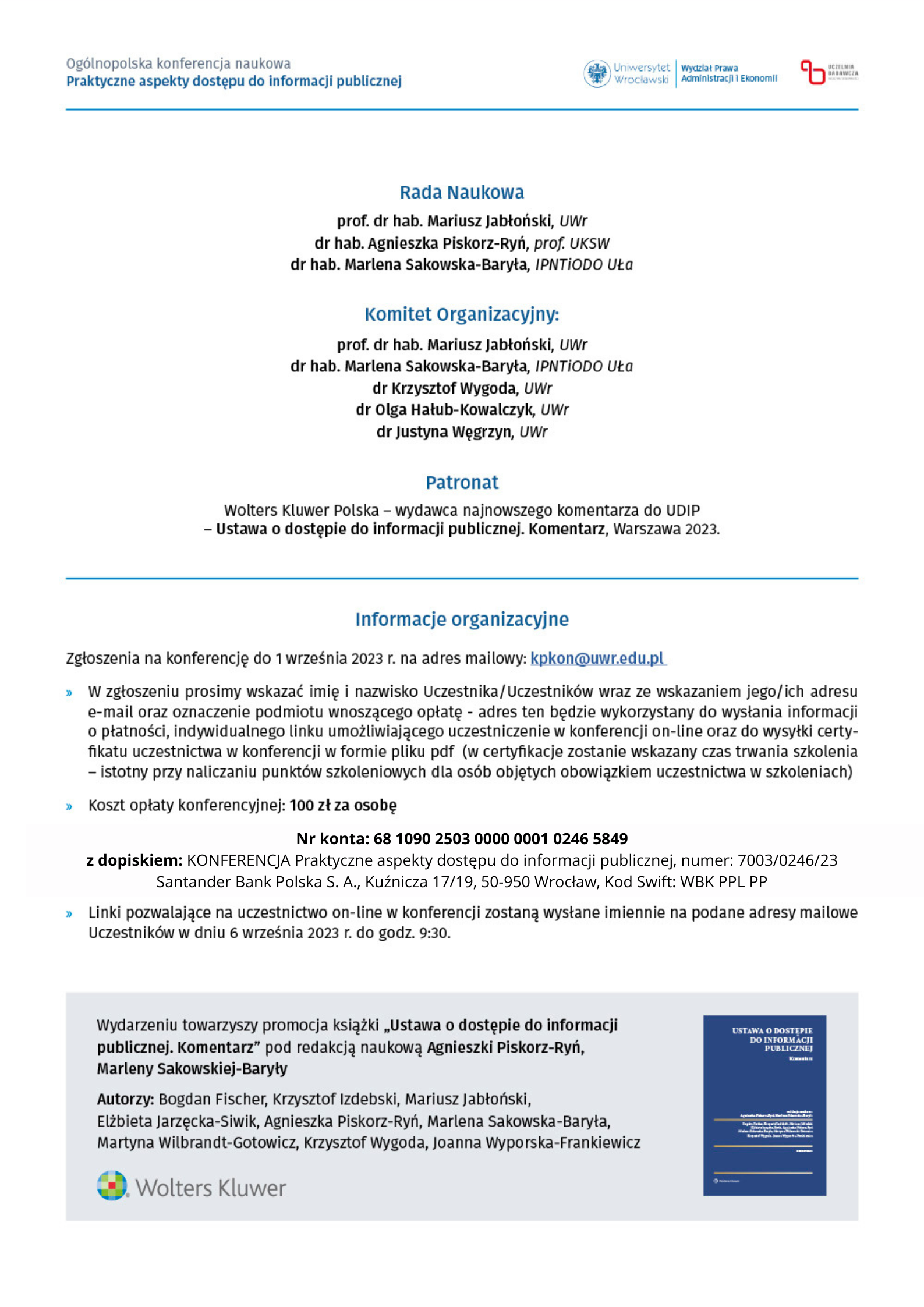 Już 6 września (w związku z 22 rocznicą uchwalenia ustawy o dostępie do informacji publicznej) serdecznie zapraszam na konferencję organizowaną przez Katedrę Prawa Konstytucyjnego na Wydział Prawa, Administracji i Ekonomii Uniwersytetu Wrocławskiego.