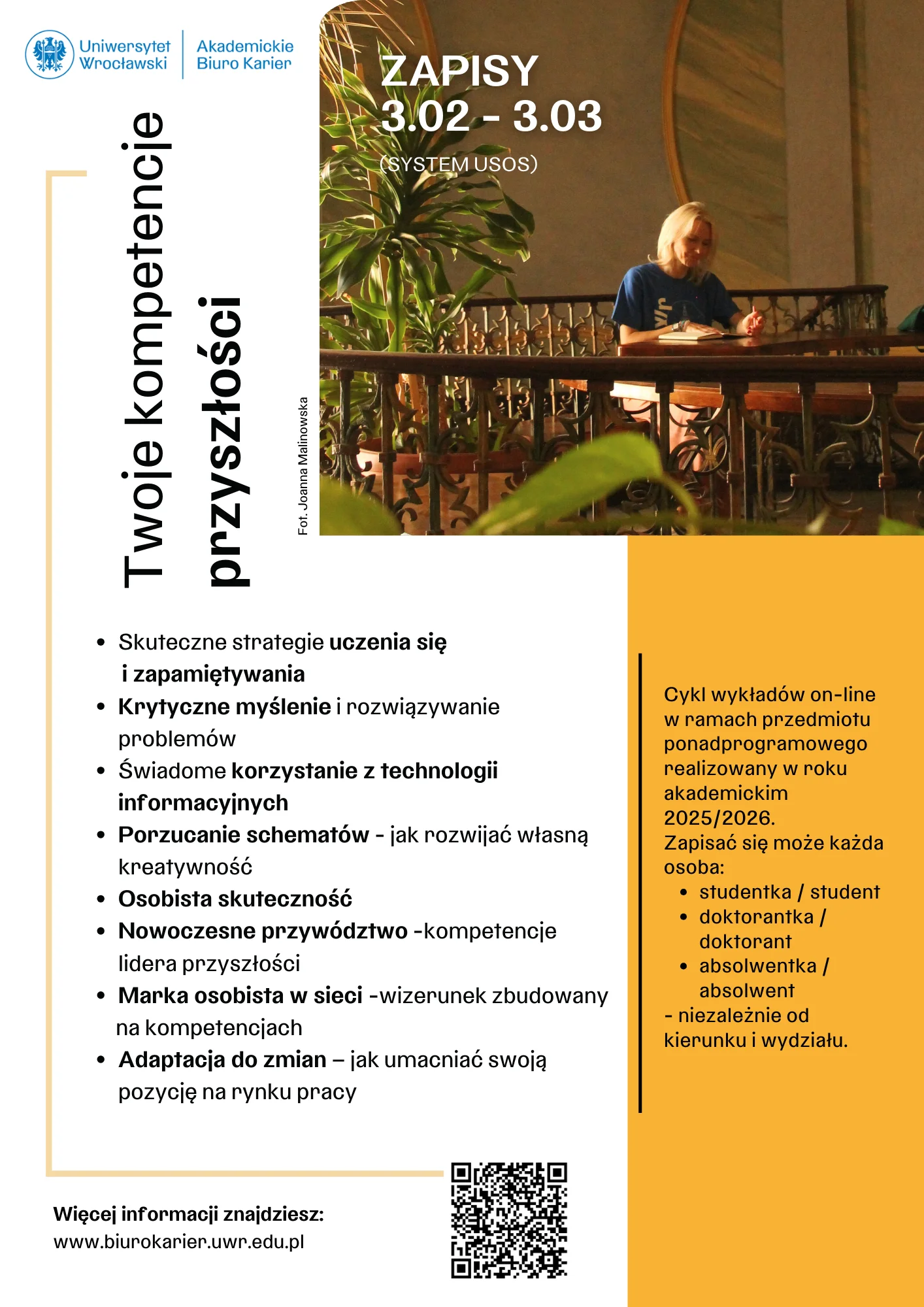 Twoje kompetencje przyszłości – to cykl inspirujących wykładów, które odczarują kompetencje przyszłości, pokażą jak stać się poszukiwanym i cenionym pracownikiem czy przedsiębiorcą. Na wykładach realizowanych w ramach nowego przedmiotu dowiesz się m.in. jak skutecznie się uczyć, krytycznie analizować otrzymywane informacje, budować swoją osobistą skuteczność czy rozwijać kreatywność. A wszystko to z realnej, biznesowej perspektywy!