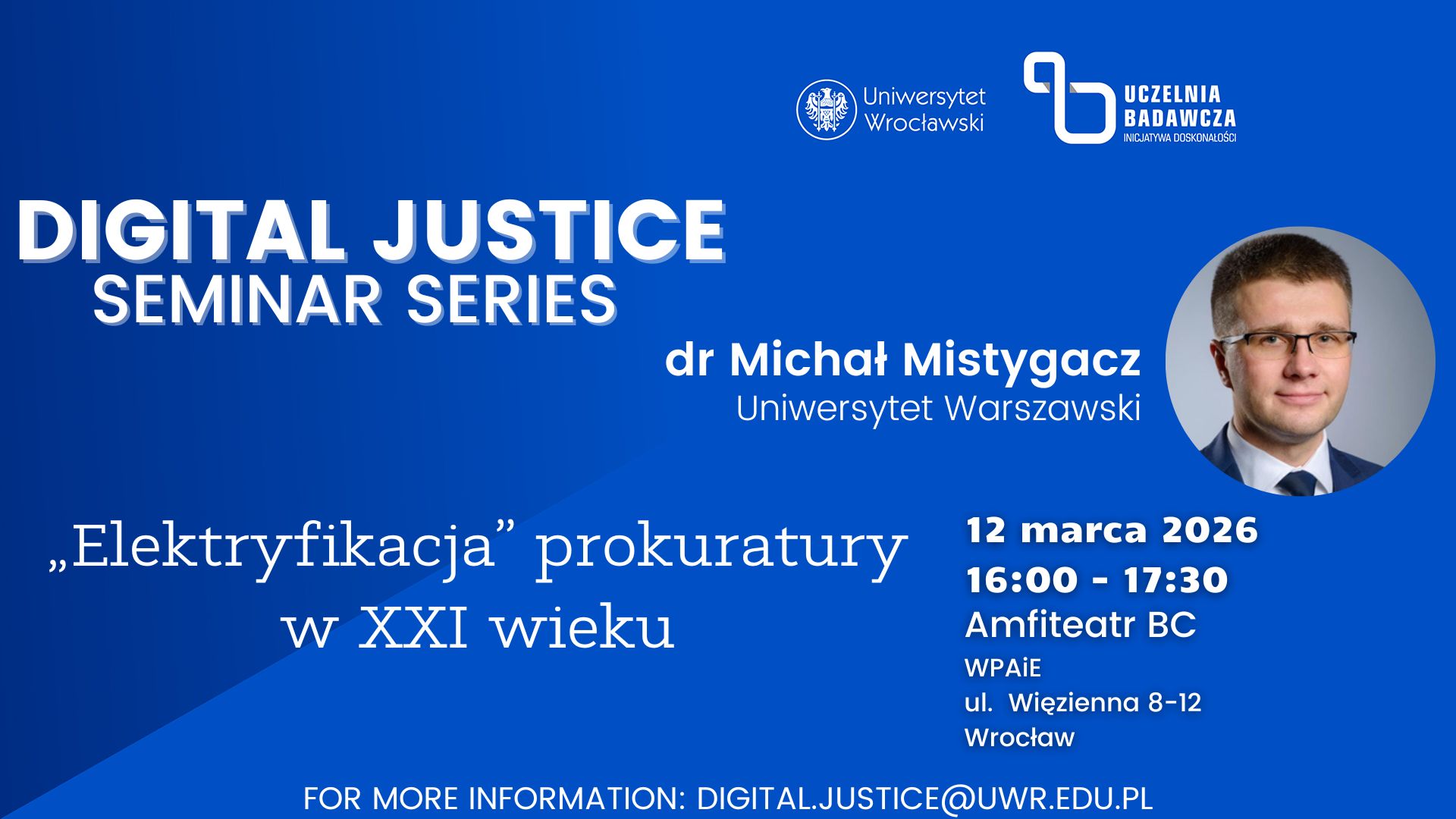 12 marca 2026 r. o godzinie 16:00 w Amfiteatrze BC odbędzie się wykład pt. „Elektryfikacja” prokuratury w XXI wieku, którego prelegentem będzie dr Michał Mistygacz – adiunkt na Uniwersytecie Warszawskim, Prokurator Okręgowy w Warszawie, Członek Komisji Kodyfikacyjnej ds. Ustroju Sądownictwa i Prokuratury.