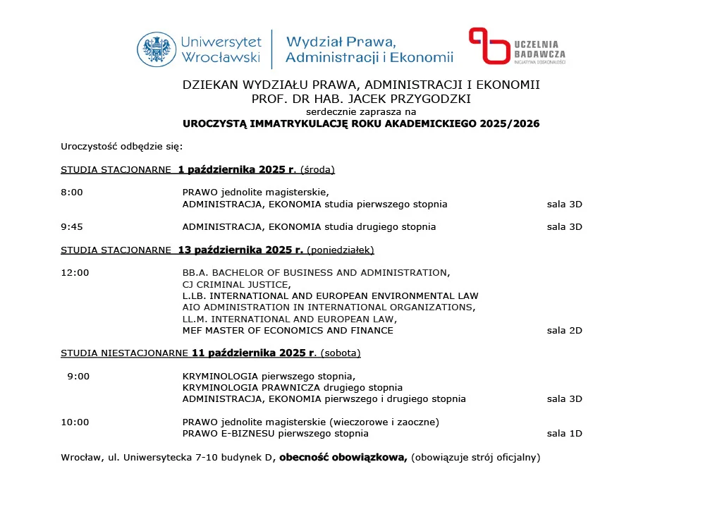 Szanowni Państwo! Uprzejmie informujemy, że począwszy od 2 października 2025 r. Uniwersytecka Poradnia Prawna wznawia swoją działalność po przerwie wakacyjnej. Sprawy do opracowania porady przyjmowane są aktualnie drogą mailową oraz w drodze tradycyjnej korespondencji listowej. W późniejszym terminie planowane jest także uruchomienie dyżurów stacjonarnych. Szczegółowe informacje o działalności poradni i możliwości uzyskania porad znajdują się pod adresem: https://prawo.uwr.edu.pl/uniwersytecka-poradnia-prawna/